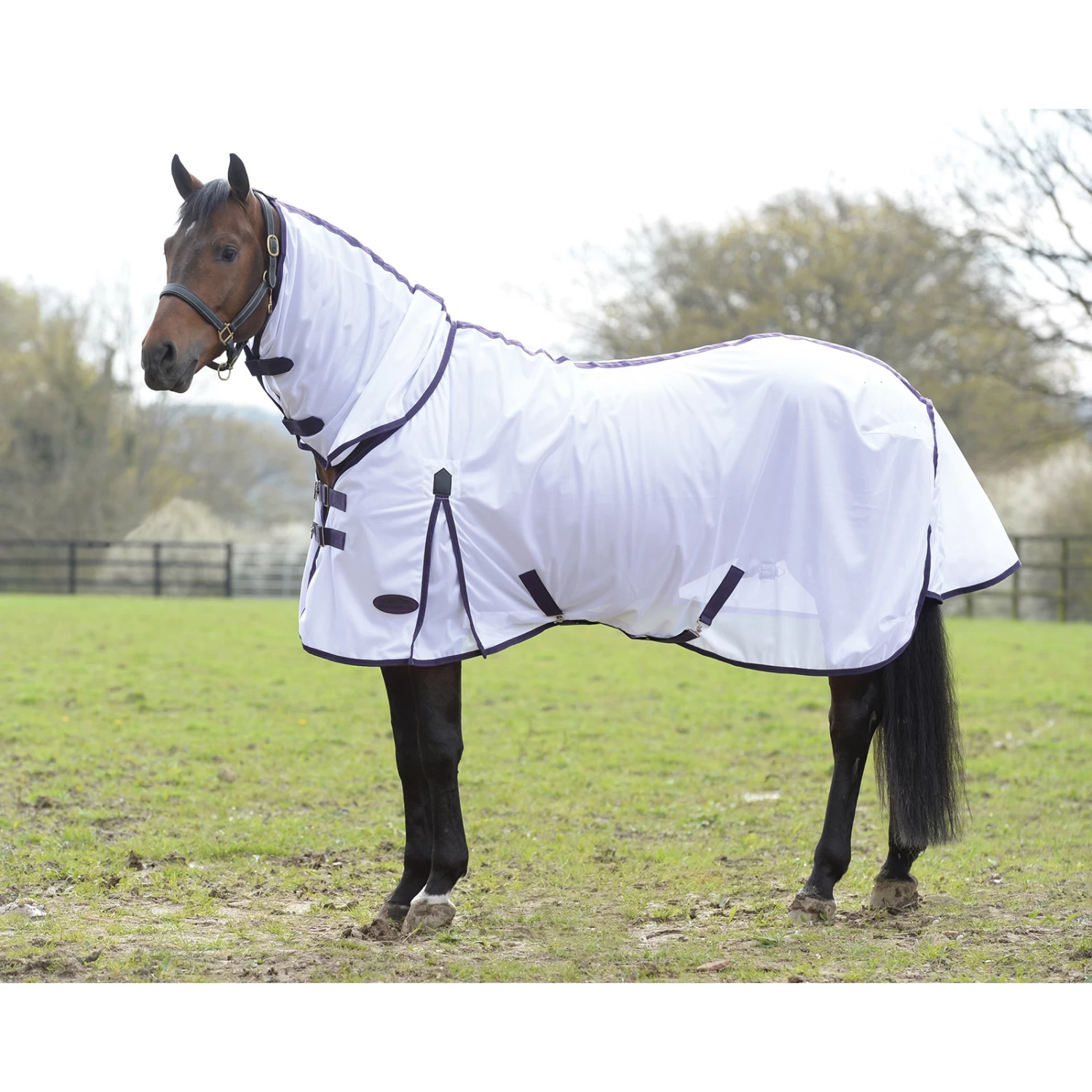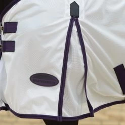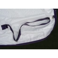 Fliegenschutz aus weichem Mesh mit 210D Nylon Auskleidung an den Schultern, der Mähne und dem Schweif, mit neuem, doppeltem Frontverschluss, traditionellen, seitlichen Gehfalten für Bewegungsfreiheit, niedrig angesetzter Kreuzbegurtung, großem Schweiflatz und verstellbaren, abnehmbaren Beinschnüren.